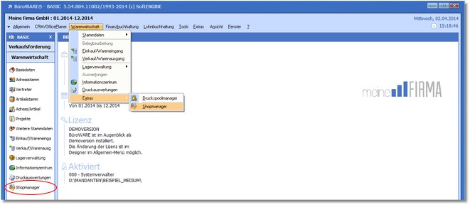 1. Klicken Sie mit der Maus im Hauptmenü auf "Warenwirtschaft > Extras > Shopmanager"