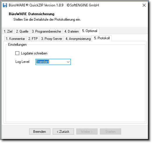 Hier kann eingestellt werden ob und in welchem Maße der Log während des Sicherungsvorgangs geschrieben wird.