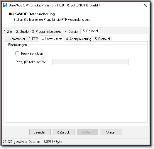 << Hier KLicken um eine Inhaltsübersicht anzuzeigen >> Navigation: Datenbankassistent > Datenarchivierung > BWQuickZip > Die Karteikarte "Optional" > Die Karteikarte "Proxy Server" |