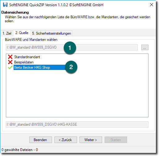 Auf der Registerkarte „2. Quellen“ finden Sie den aktuellen BüroWARE-Pfad und die Mandanten der BüroWARE-Installation.