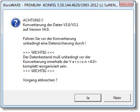 Sie können den Vorgang mit <Ja> abbrechen, um zuvor die notwendige Datensicherung bzw. Reorganisation durchführen zu können.