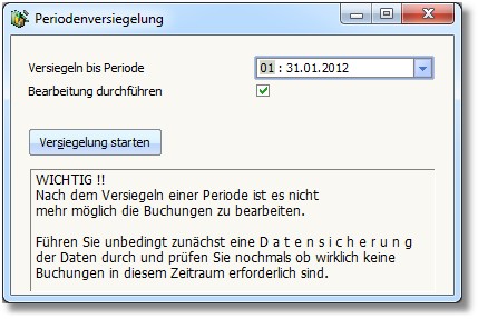 Versiegelt werden alle Perioden bis zu der in diesem Feld angegebenen Periode. Geben Sie also die Periode 3 an, so werden die Perioden 1, 2 und 3 versiegelt bzw. abgeschlossen. |