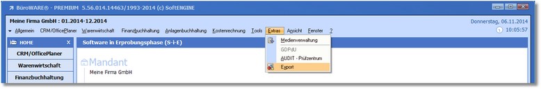 1. Klicken Sie im Hauptmenü auf den Menüeintrag "Extras > GDPdU - Export".