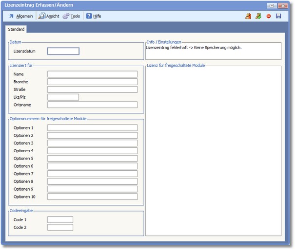 2. | Wählen Sie anschließend im Designer den Menüpunkt "Allgemein > Lizenzerfassung" und halten Sie den Lizenzschlüssel bereit.![]() Es erscheint zunächst die Eingabemaske der Lizenzerfassung mit leeren Feldern. ![]() |