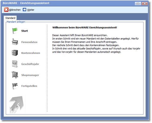 4. Folgen Sie nun den Anweisungen des Assistenten, der Sie Schritt für Schritt durch die Mandantenanlage geleitet.
