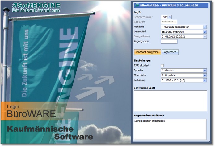Im Feld MANDANT wählen Sie den Mandanten (die Firma). Es wird Ihnen immer der zuletzt bearbeitete Mandant vorgeschlagen. Beim ersten Start des Programms ist der Beispielmandant eingestellt.
