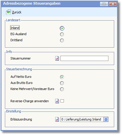 In diesem Dialogfenster sind die notwendigen Steuerangaben für die Adresse zu hinterlegen: