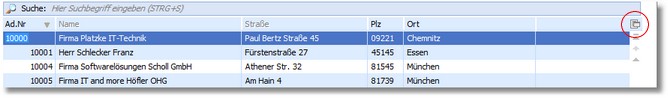 Beim Kopieren der Tabelle in die Windows-Zwischenablage oder beim Speichern der Tabelle als Datei werden die Daten der Adresse berücksichtigt, die in der Tabelle als Tabellenspalte sichtbar sind. Die erste Zeile die kopiert bzw. exportiert wird, enthält die Feld- bzw. Spaltenbezeichnungen (Kopfzeile). |
