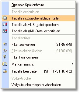 2. Im Auswahlmenü klicken Sie mit der Maus auf den Eintrag "Tabelle in Zwischenablage stellen".