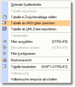 2. Im Auswahlmenü klicken Sie mit der Maus auf den Eintrag "Tabelle als ANSI-Datei speichern".
