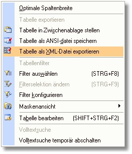 2. Im Auswahlmenü klicken Sie mit der Maus auf den Eintrag "Tabelle als XML-Datei exportieren".