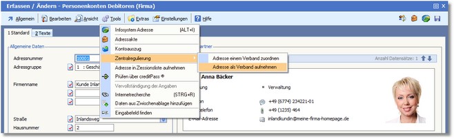 3. Im Dialog "Erfassen/Ändern Personenkonten Debitoren" wählen Sie den Menüeintrag " Tools > Zentralregulierung > Adresse als Verband aufnehmen".