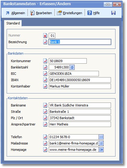 Der Bearbeitungsdialog der Bankstammdaten enthält folgende Felder:
