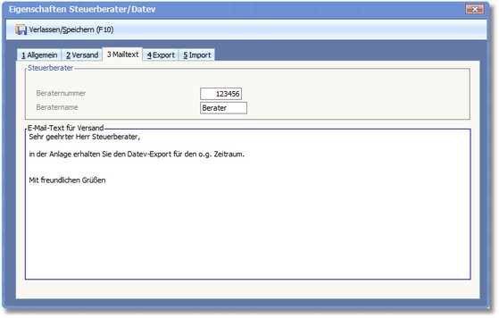 << Hier KLicken um eine Inhaltsübersicht anzuzeigen >> Navigation: Finanzbuchhaltung > Stammdaten > Basisdaten > Datevcenter > Die Karteikarte "Mailtext" |