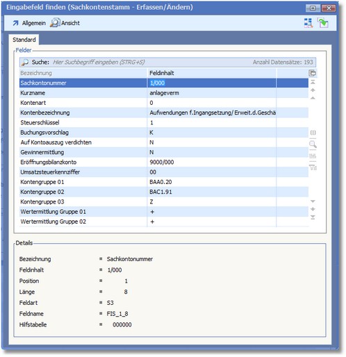 Über den Menüeintrag "Tools > Eingabefeld finden" werden alle im Sachkontenstamm verwendeten Felder mit ihrem derzeitig aktuellen Inhalt in einer Tabelle angezeigt.