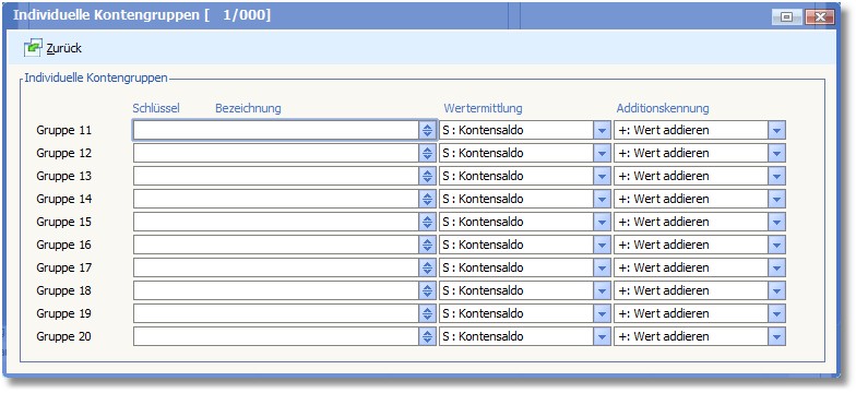 << Hier KLicken um eine Inhaltsübersicht anzuzeigen >> Navigation: Finanzbuchhaltung > Stammdaten > Sachkonten > Die Karteikarte "Sachkonten" > Sachkonten bearbeiten > Sachkontenstamm - Erfassen/Ändern > Kontengruppen > Individuelle Kontogruppen |