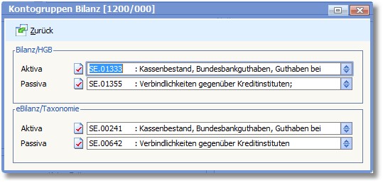 Über den Menüeintrag "Bearbeiten > Optionen/Parameter > Kontogruppen > Kontogruppen Bilanz" werden die Kontengruppen für die eBilanz angezeigt. Diese können bei der Saldenaktualisierung übernommen werden und dürfen nicht geändert werden!