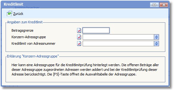 << Hier KLicken um eine Inhaltsübersicht anzuzeigen >> Navigation: Finanzbuchhaltung > Stammdaten > Personenkonten > Die Karteikarte "Adressauswahl" > Adressen erfassen/ändern > Personenkonten bearbeiten - Menü > Kreditlimit |