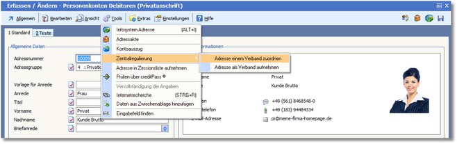 3. Im Dialog "Erfassen/Ändern Personenkonten Debitoren" wählen Sie den Menüeintrag " Tools > Zentralregulierung > Adresse einem Verband zuordnen".