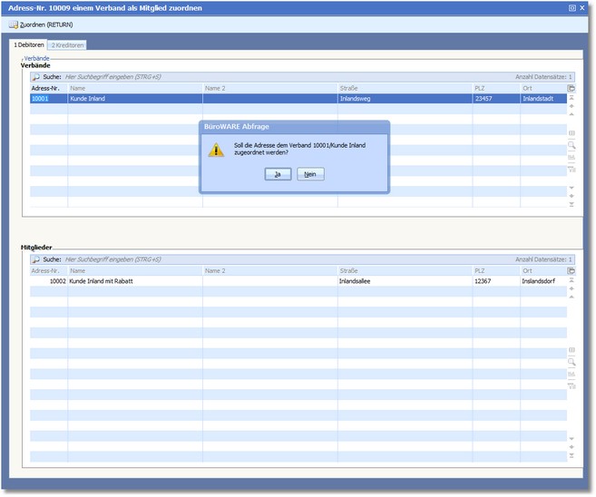 Mit [RETURN] können Sie die Adresse dem in der Tabelle markierten Verband nach Bestätigung der nachfolgenden Abfrage zuordnen.