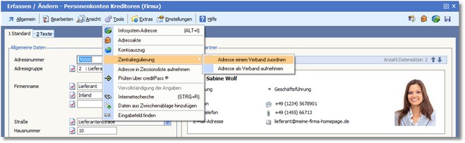 3. Im Dialog "Erfassen/Ändern Personenkonten Kreditoren" wählen Sie den Menüeintrag " Tools > Zentralregulierung > Adresse einem Verband zuordnen".