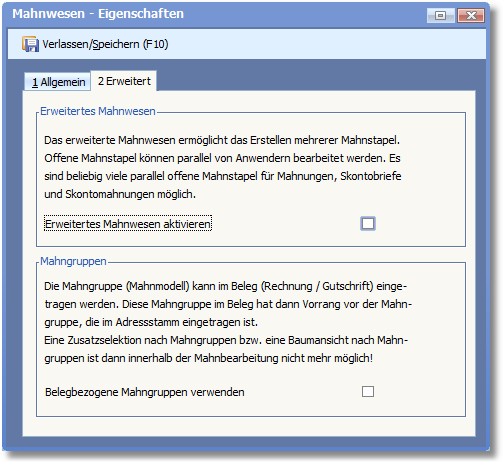 In der Karteikarte "Erweitert" können Sie das erweiterte Mahnwesen sowie die Verwendung von belegbezogenen Mahngruppen aktivieren.