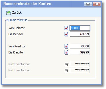 Über den Menüpunkt "Bearbeiten > Nummernkreise der Konten" in den Basisdaten werden die Nummernkreise für Kunden und Lieferanten festgelegt. Die Felder sind bereits mit den Werten aus dem Einrichtungsassistenten belegt. Diese sind identisch zu den Nummernkreisen aus der Warenwirtschaft.