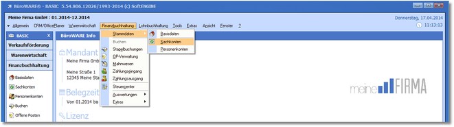 1. | Klicken Sie mit der Maus im Hauptmenü auf "Finanzbuchhaltung > Stammdaten > Sachkonten". |