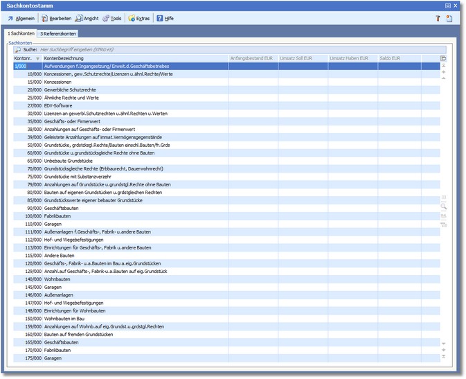 Die Sachkontenverwaltung besteht aus zwei Karteikarten und der Menüleiste mit den für die jeweils aktive Karteikarte bereitgestellten Funktionen.