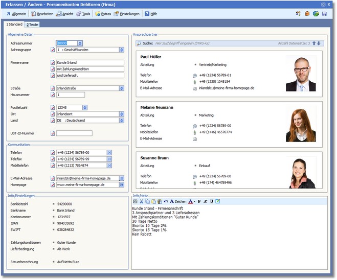 In diesem Bereich werden Bankverbindung, Zahlungskonditionen, Lieferbedingung und Steuerberechnung der Adresse angezeigt.