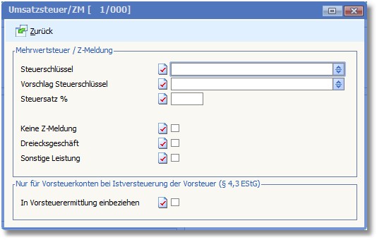 << Hier KLicken um eine Inhaltsübersicht anzuzeigen >> Navigation: Finanzbuchhaltung > Stammdaten > Sachkonten > Die Karteikarte "Sachkonten" > Sachkonten bearbeiten > Sachkontenstamm - Erfassen/Ändern > Umsatzsteuer/ZM |