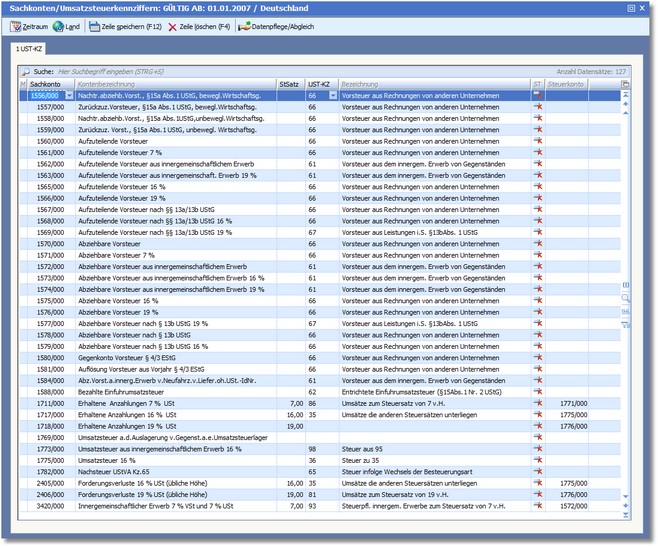 Hier sind in einer Tabelle die Sachkonten mit zugeordneten USt-Kennziffern ersichtlich und können mit den Funktionen der Symbolleiste bearbeitet werden.