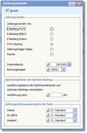 Legen Sie durch Aktivierung des entsprechenden Radiobuttons fest, auf welche Art und Weise der Zahlungsverkehr erfolgen soll.