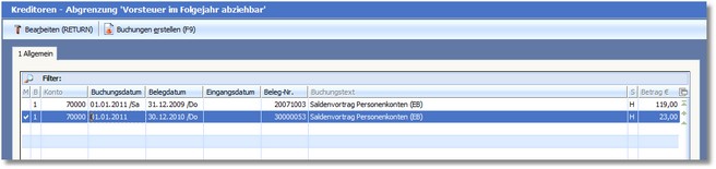 Das Programm öffnet den Dialog "Kreditoren - Abgrenzung "Vorsteuer im Folgejahr abziehbar".