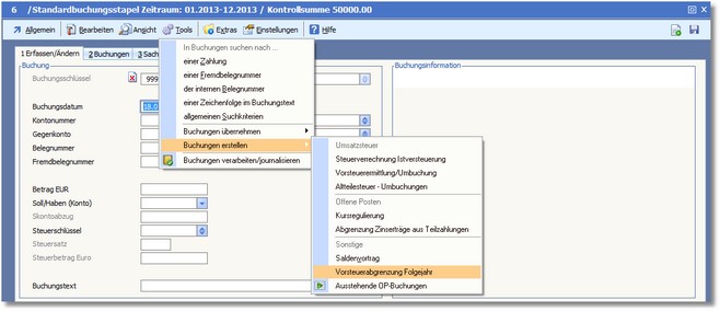 1. Wählen Sie in der Buchungsmaske den Menüpunkt "Tools > Buchung erstellen > Vorsteuerabgrenzung Folgejahr".