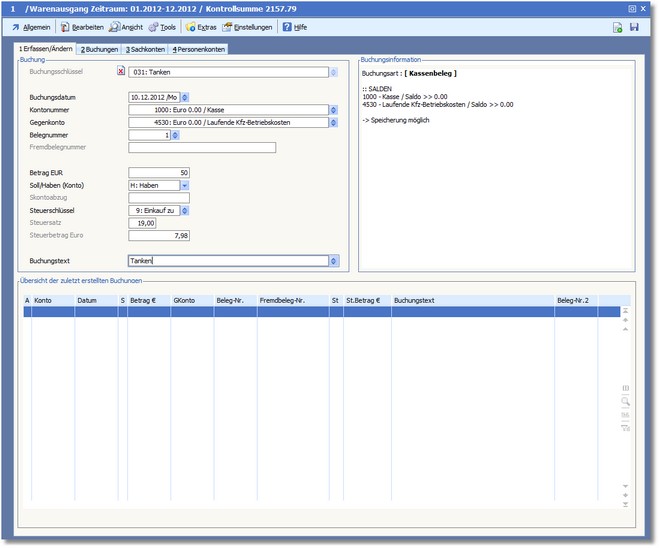 Erfassung von Geschäftsvorfällen über die Buchungsmaske.