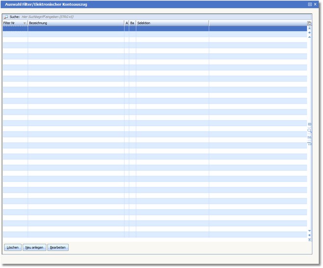 << Hier KLicken um eine Inhaltsübersicht anzuzeigen >> Navigation: Finanzbuchhaltung > Stammdaten > Basisdaten > Filterdefinition/Elektronischer Kontoauszug |