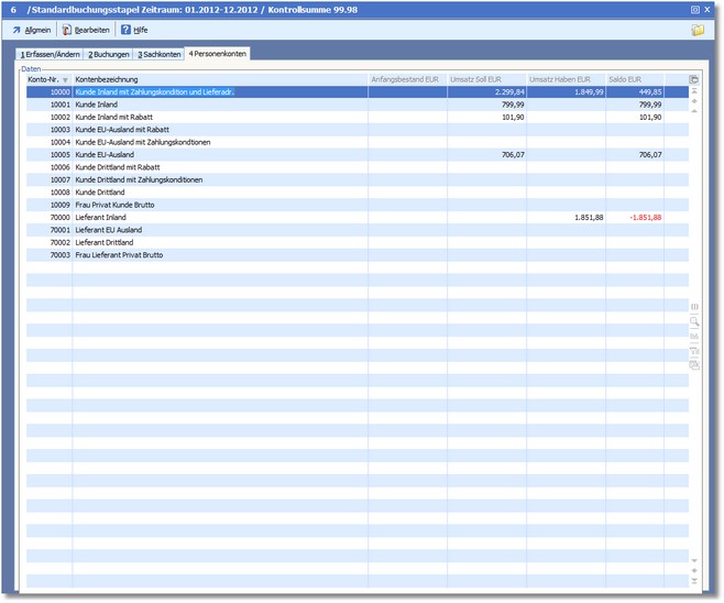 Zunächst erhalten Sie in der vorgelagerten Auswahltabelle eine Übersicht über die vorhandenen Personenkonten mit dem aktuelle Kontensaldo Euro angezeigt.