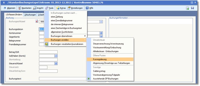 1. | Wählen Sie in der Buchungsmaske den Menüpunkt "Tools > Buchung erstellen > Kursregulierung". |