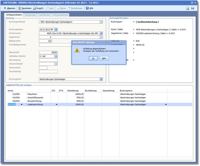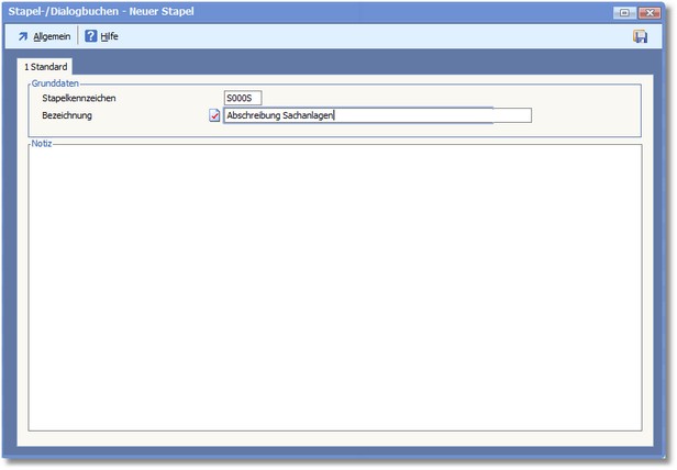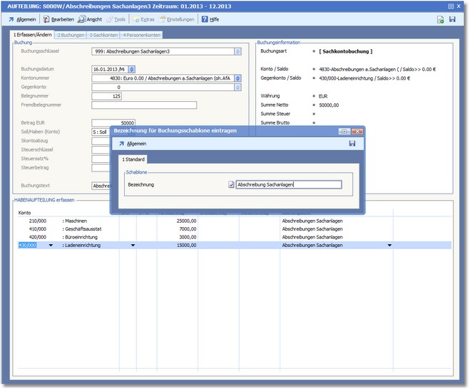1. Öffnen Sie den Buchungsbereich über das Hauptmenü „Finanzbuchhaltung > Stapelbuchungen". 2. Aktivieren Sie hier die Karteikarte "Schablonen" und drücken Sie [F3], um einen neuen Stapel zu erfassen. 3. Legen Sie eine BEZEICHNUNG für den Stapel fest und speichern Sie Ihre Eingaben mit [F10]. 4. Starten Sie den Stapel mit [RETURN] und erfassen Sie die Buchung als normale Aufteilungsbuchung. 5. Nach kompletter Aufteilung bestätigen Sie die nachfolgende Abfrage nach der Verbuchung mit <ja>. 6. Nach der Verbuchung legen Sie eine Bezeichnung für die soeben erstellte Buchungsschablone fest und speichern Sie diese Eingabe mit [F10].