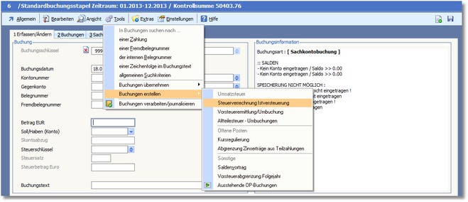 1. Wählen Sie in der Buchungsmaske den Menüpunkt "Tools > Buchungen erstellen > Steuerverrechnung/Istversteuerung"".