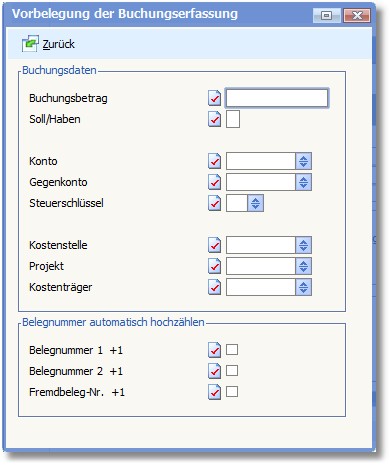 In dieser Maske können Sie die Buchungsmaske mit Werten vorbelegen: