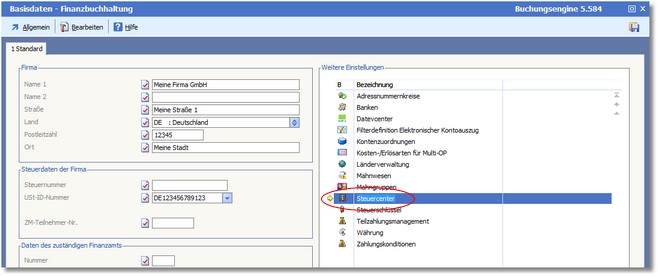 << Hier KLicken um eine Inhaltsübersicht anzuzeigen >> Navigation: Finanzbuchhaltung > Stammdaten > Basisdaten > Steuercenter |
