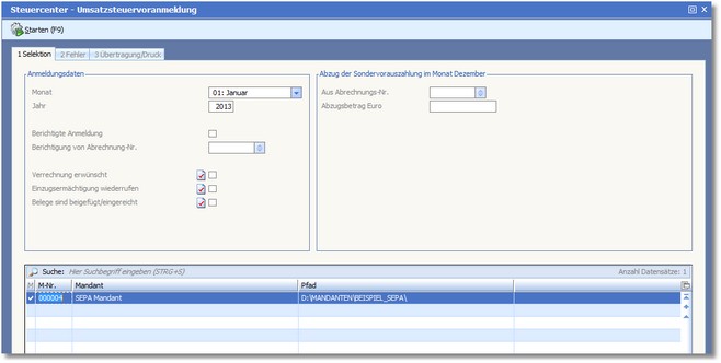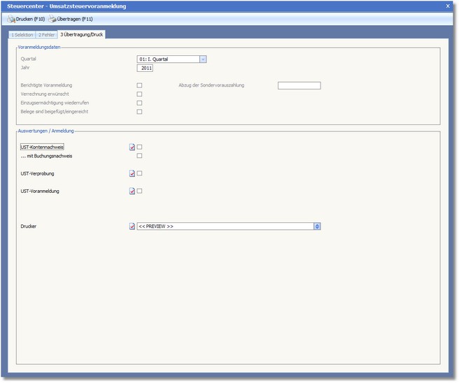 Der Dialog zur Erstellung der Umsatzsteuervoranmeldung wird zunächst mit der Karteikarte "Selektion" geöffnet.