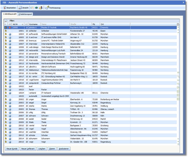 Dieses System stellt Informationen über die bebuchten Personenkonten bereit. Nach Aufruf dieses Bereiches öffnet sich die Auswahltabelle der Personenkonten.