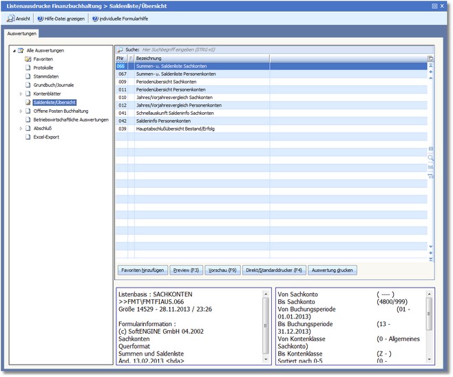 << Hier KLicken um eine Inhaltsübersicht anzuzeigen >> Navigation: Finanzbuchhaltung > Auswertungen > Druckauswertungen > Saldenlisten/Übersicht |