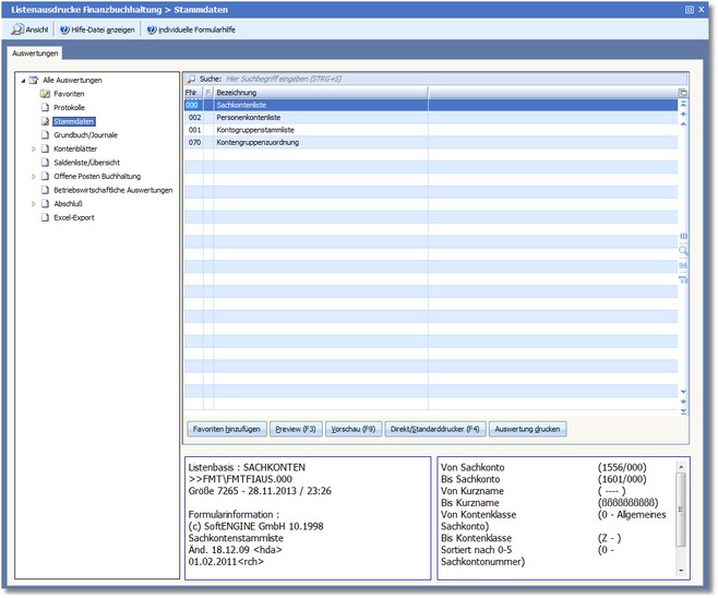 << Hier KLicken um eine Inhaltsübersicht anzuzeigen >> Navigation: Finanzbuchhaltung > Auswertungen > Druckauswertungen > Stammdatenlisten |