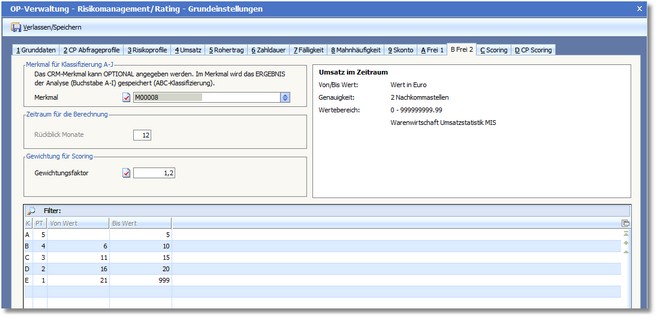 << Hier KLicken um eine Inhaltsübersicht anzuzeigen >> Navigation: Finanzbuchhaltung > OP-Verwaltung > Debitorenkennzahlen/Rating > Debitorenrating einrichten > Die Karteikarten "Frei 1" und "Frei 2" |
