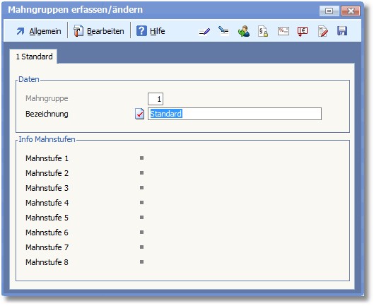 Nachdem Sie die [RETURN]- oder [F3]-Taste in der Auswahltabelle des Mahngruppenstammes betätigt haben, öffnet sich der Erfassungsdialog. Über die Funktionen der Menüleiste können weitere Einstellungen zu den jeweiligen Mahngruppen hinterlegt werden.
