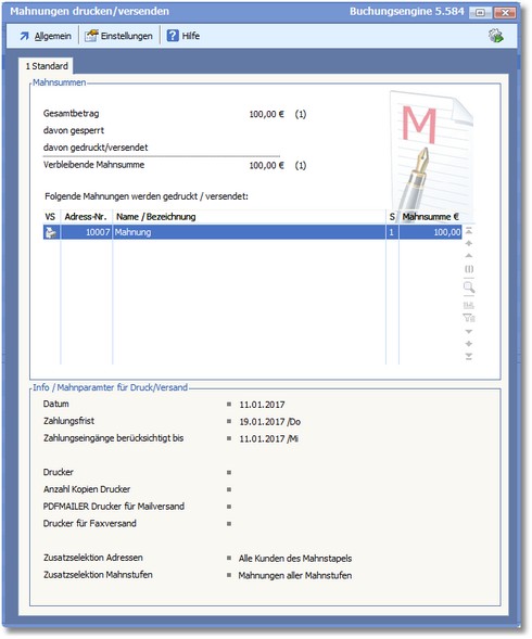 << Hier KLicken um eine Inhaltsübersicht anzuzeigen >> Navigation: Finanzbuchhaltung > Mahnwesen > Mahnungen drucken/versenden |